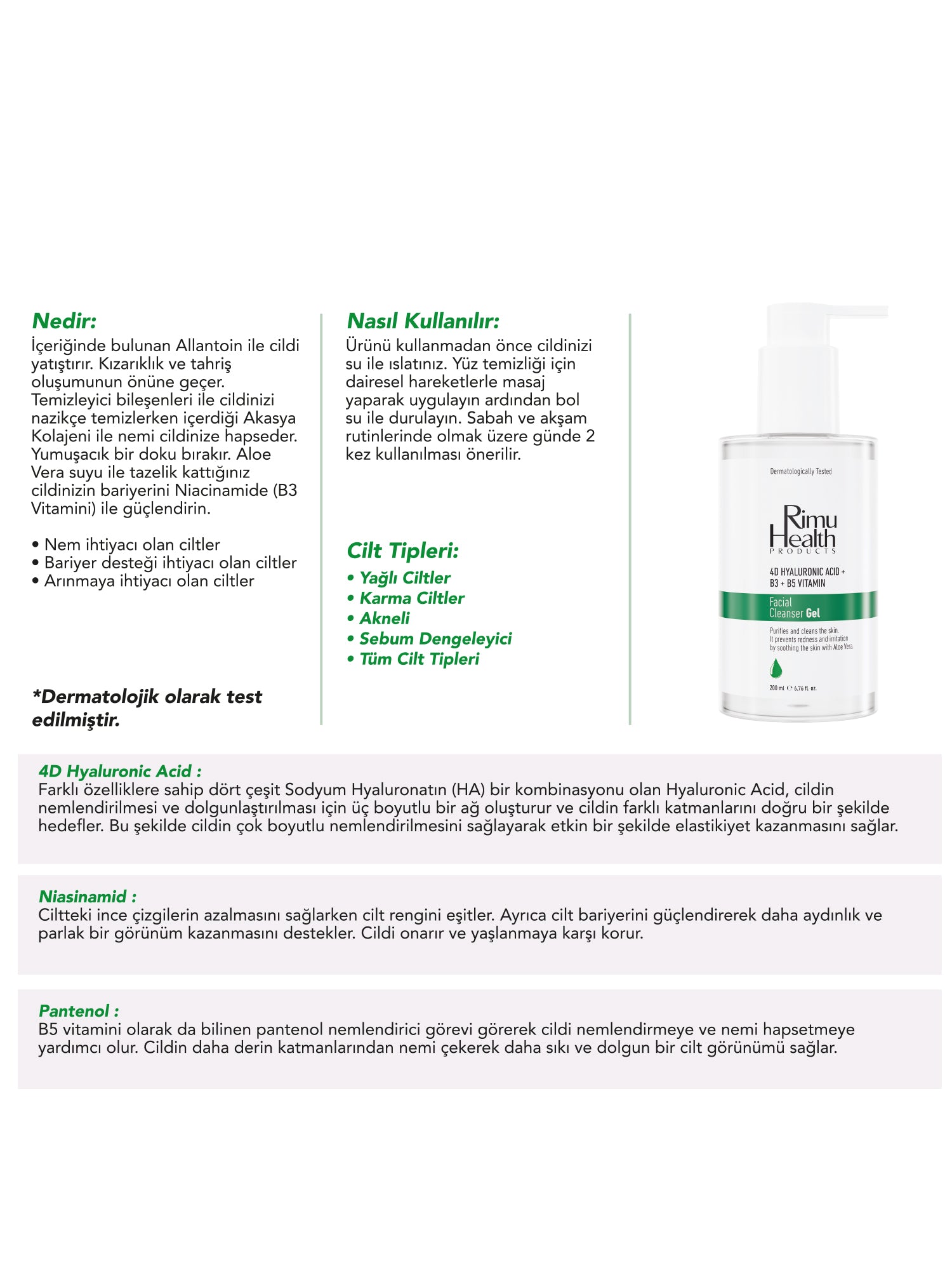 Nedir : İçeriğinde bulunan Allantoin ile cildi yatıştırmaya yardımcı olur. Nazikçe temizlerken içerdiği Akasya Kolajeni ile nemin cildinize hapseder, yumuşacık bir doku bırakır. Aloe Vera suyu ile tazelik kattığınız cildinizin bariyerini Niacinamide (B3 Vitamini) ile güçlendirin.
